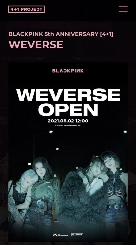 14 Temmuz’da YG Entertainment, BLACKPINK‘in Weverse hayran topluluğunun resmi olarak 2 Ağustos’ta başlayacağını doğruladı. Bu yeni platform aracılığıyla BLINK‘ler (BLACKPINK’in resmi fandom adı) ve BLACKPINK üyeleri arasındaki iletişimin artması bekleniyor.