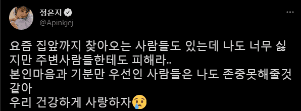 Apink’ten Eunji bugün Twitter hesabı üzerinden bir sasaeng ( bir grup veya üyeye saplantılı, beğendiği idollere karşı aşırı hareketlerde bulunan K-Pop hayranlarına verilen isimdir.) hakkında söylemlerde bulundu.