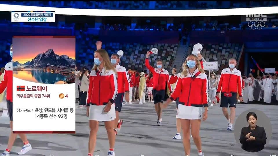 MBC, olimpiyatlara katılan atletleri tanıtırken bir sürü resim kullandı – bu resimlerin, ilgili olduğu ülkeleri temsil etmesi gerekiyordu. Örneğin MBC, Norveçli atletleri tanıtırken bir dizi resim kullandı ve Norveç haritasını, Lofoten takım adalarını, ülkenin sporu olan kayakçılığı ve somon resimlerini koydu.
