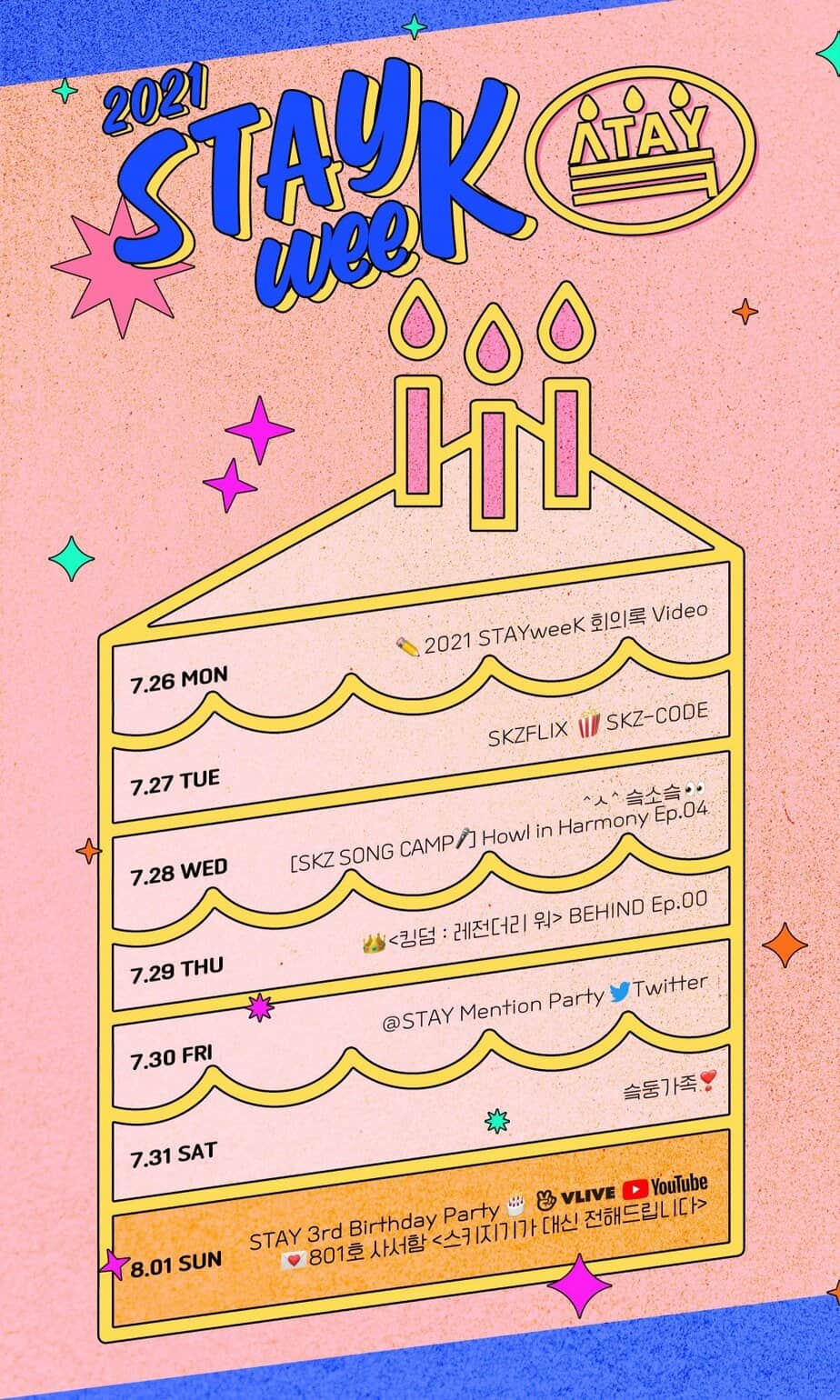 Bu programa göre Stray Kids, STAY’lerin resmi olarak oluşumunun 3. yıl dönümünü kutlayacak. 26 Temmuz’da “STAYweeK” için buluşma videosu yayımlayacaklar, sonraki gün SKZFLIX SKZ-CODE videosu, ertesi gün “[SKZ SONG CAMP] Howl In Harmony”nin 4. bölümü, 29 Temmuz’da “Kingdom: Legendary War” yarışmasındaki intro sahnelerinin kamera arkası videosu, 30 Temmuz’da Twitter’da mention partisi, ertesi gün “SKZ Family (SK-DOONG Family)” videosu yayımlanacak ve son olarak 1 Ağustos’ta V Live – YouTube canlı yayınlarında doğum günü partisi düzenlenecek.