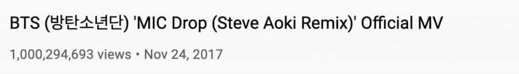 “MIC Drop (Steve Aoki Remix)“, BTS‘in “DNA“, “Boy With Luv” ve “Dynamite“tan sonra 1 milyar izlenmeye ulaşan 4. müzik videosu oldu.