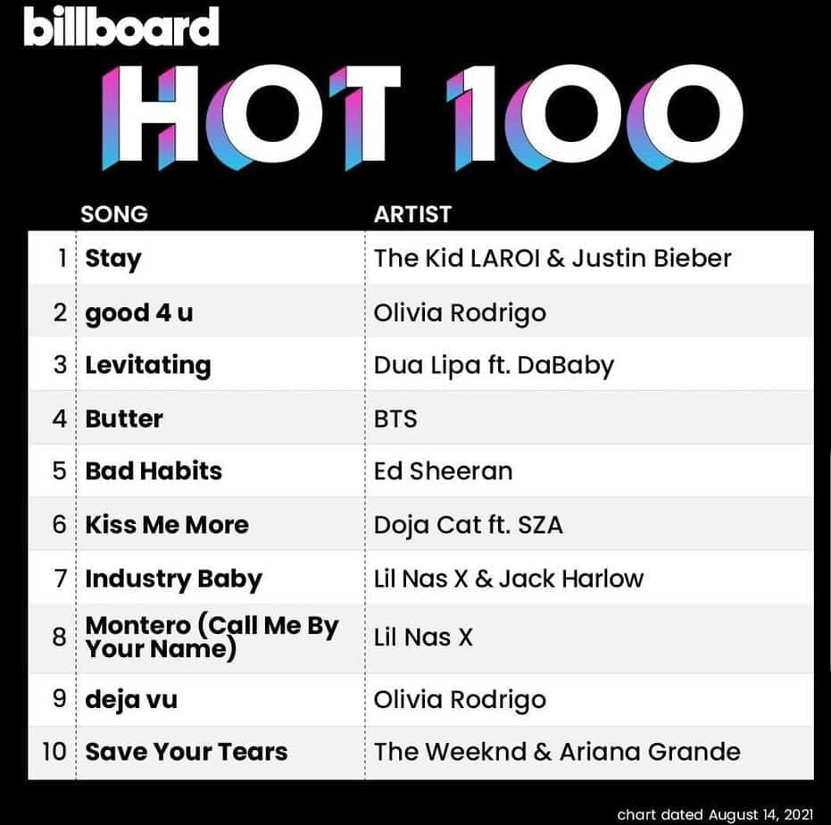The #Hot100 top 10 (chart dated Aug. 14, 2021)