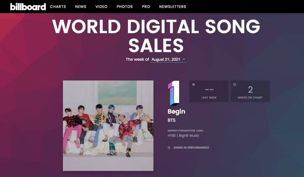 Yayımlanmasından yaklaşık 5 yıl sonra, BTS‘in 2016 albümü “WINGS”te yer alan Jungkook‘un B-Side solo şarkısı “Begin”, 21 Ağustos’ta sona eren hafta boyunca Billboard‘un Dünya Dijital Şarkı Satışları listesine 1 numaradan girerek grubun listenin zirvesine çıkan 31. şarkısı oldu.