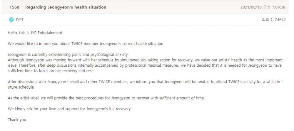 18 Ağustos’ta JYP Entertainment duyuruyu TWICE’ın resmi duyuru panosunda yaptı. Şirketin duyurusuna göre, Jungyeon şu anda panik ve psikolojik kaygı sorunları yaşıyor ve tıp uzmanlarına danışıldıktan sonra iyileşmeye odaklanması için zaman ayırmasına karar verildi.