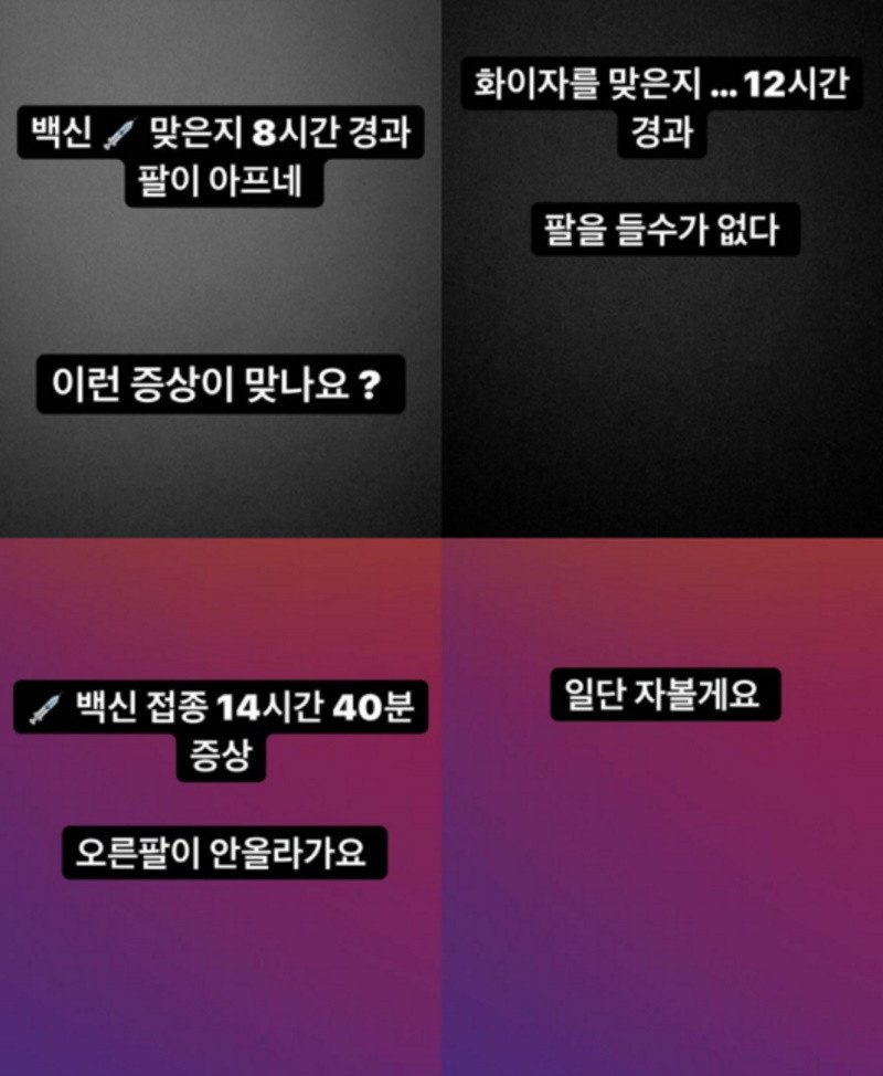 Super Junior üyesinin paylaşımları şu şekilde, “Aşı vurulmamın üzeriden sekiz saat geçmiş olmasına rağmen kolum ağrıyor. Bu normal bir semptom mu?“, “Pfizer aşısı yaptıralı 12 saat oldu. Kolumu kaldıramıyorum.”, “Semptomlar devam ediyor. Aşı olduğumdan bu yana 14 saat 40 dakika geçti hala sağ kolum kalkmıyor.” ve “Şimdilik uyuyacağım.”