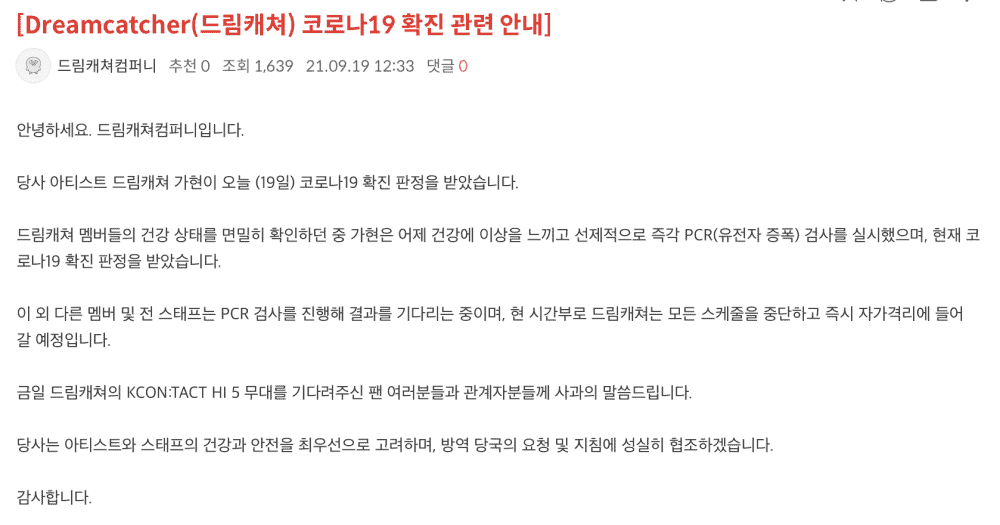 “Merhaba,biz Dremcatcher Company. Sanatçımız Gahyeon COVID19’a yakalanmıştır. Dün sağlığıyla ilgili bazı şikayetler yaşayan Gahyeon test verdi ve sonucu pozitif çıktı. Diğer grup üyeleri ve tüm personel PCR testi verdi. Sonuçların çıkmasını bekliyoruz. Şu andan itibaren Dreamcatcher’ın faaliyetleri askıya alınmıştır ve karantinaya alınmışlardır. Bugün “Dreamcatcher’s KCON:TACT HI 5″ etkinliğini bekleyen hayranlardan özür dileriz. Sanatçılarımızın ve personellerimizin sağlığına güvenliğine öncelik vereceğiz. Sağlık durumları sıkı bir şekilde takip edilecek ve karantina devam edecek.Teşekkürler…”