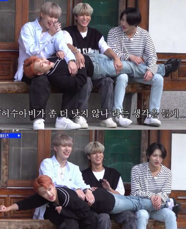 Üyelerin dizlerine nasıl da uzanmış…ㅋㅋㅋㅋㅋㅋㅋㅋㅋ ATEEZ’in lideri o ama yine de çok tatlı ㅠㅠ