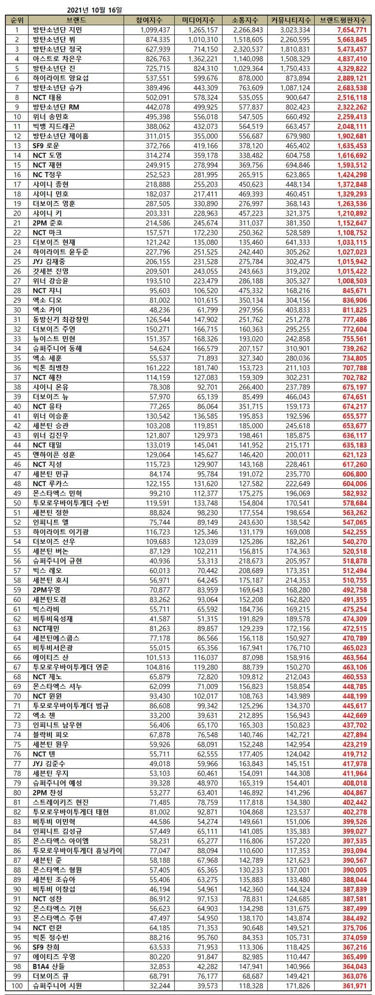 Sıralamalar, 16 Eylül – 15 Ekim tarihleri arasında toplanan büyük veriler kullanılarak, 632 erkek grubu üyesinin; tüketici katılımı, medya kapsamı, iletişim ve toplum farkındalığı indekslerinin analiziyle belirlendi.