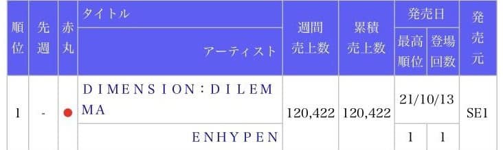 19 Ekim’de ENHYPEN‘ın son albümü “DIMENSION : DILEMMA“nın, Oricon Haftalık Albüm listesinde 1 numaradan çıkış yaptığı duyuruldu. “DIMENSION : DILEMMA“, Oricon‘da 1 hafta içinde tam olarak 120.422 kopya sattı.