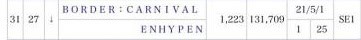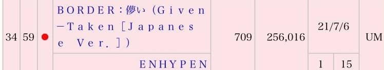 Ayrıca grubun geçen sene yayımlanan çıkış albümü “BORDER : DAY ONE“, Oricon Haftalık Albüm listesinde bu hafta 48. sırada yer alırken; Nisan ayında yayımlanan ikinci mini albümü “BORDER : CARNIVAL“, listede 31 numarada yer aldı. ENHYPEN‘ın Japonca çıkış albümü “BORDER : Hakanai” ise, Oricon Haftalık Single listesinde 34 numarada yer aldı.