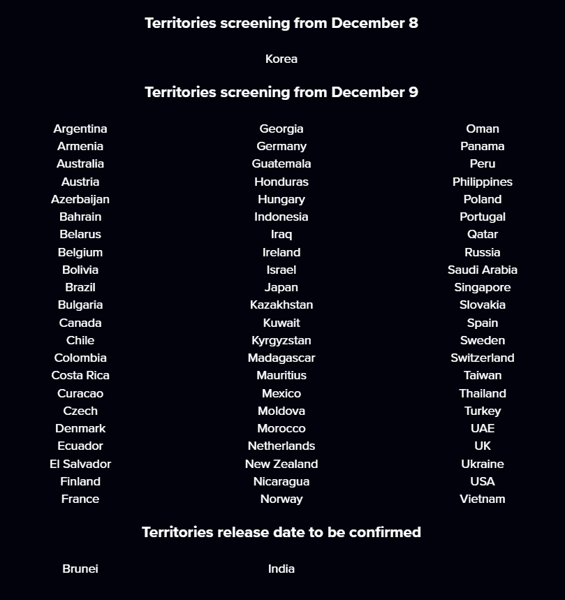 Film, 8 Aralık’ta Güney Kore’de prömiyerini yapacak ve 9 Aralık itibariyle Türkiye ve Azerbaycan dahil farklı ülkelerde yayımlanacak. (Not: Liste ileride değişebilir)