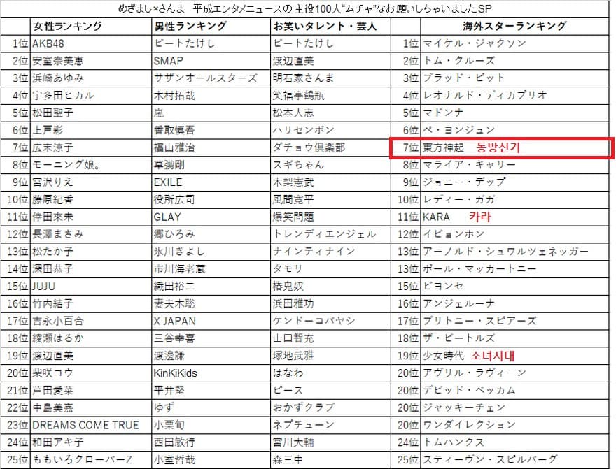TVXQ 7. sırada, KARA 11. ve Girls’ Generation 19. sırada.