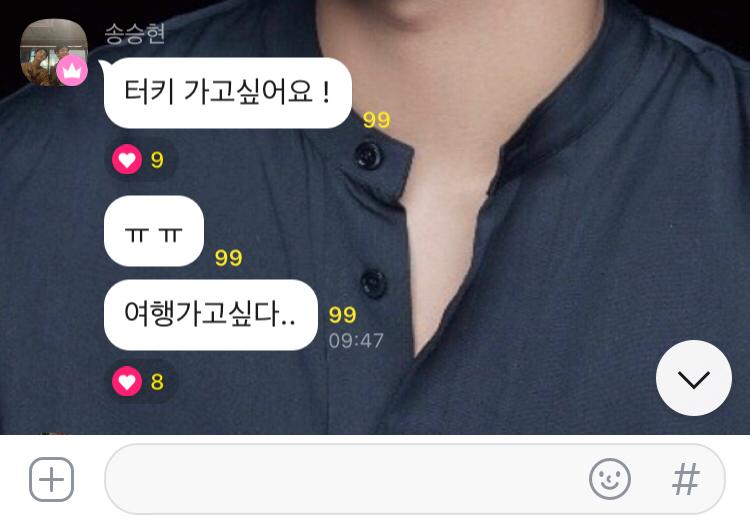 Song Seung Hyun, Instagram paylaşımının yanı sıra fanlarla sohbet ettiği Kakao Talk grubunda da “Türkiye’ye gitmek istiyorum ! ㅠㅠ Seyahat etmek istiyorum..” yazdı.