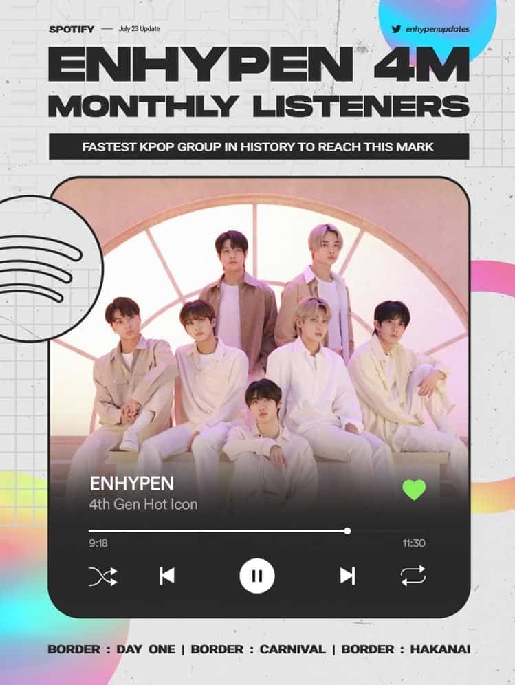 Ayrıca ENHYPEN; 2020 çıkışlı gruplar arasında en fazla Spotify takipçi sayısına sahip olmakla birlikte, genel anlamda en fazla takipçi sayısına sahip üçüncü 4. nesil K-Pop erkek grubu konumunda.
