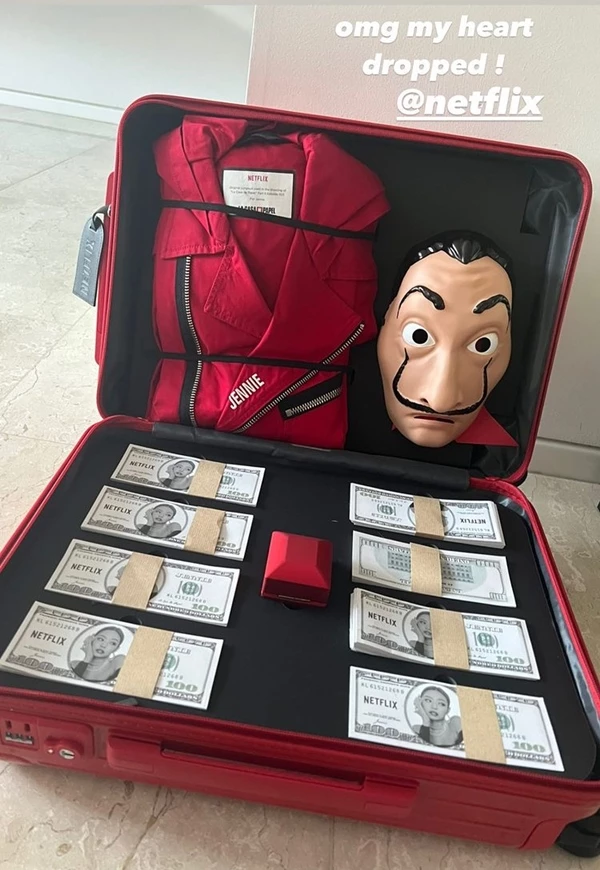 Jennie 17 Aralıkta Instagram hesabında “Aman tanrım,kalbim pır pır etti.” yazısıyla hikaye ve gönderi paylaştı. Videoda Jennie “Money Heist” isimli hediye kutusunu açıyor ve sevincini dile getiriyor.