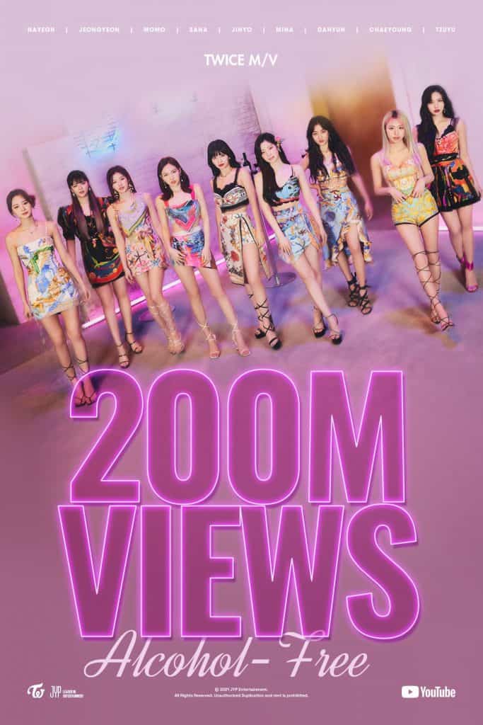 “Alcohol-Free“, TWICE‘ın 200 milyon görüntülenmeye ulaşan 15. müzik videosu oldu ve TWICE, 200 milyon görüntülenmeye ulaşan en fazla müzik videosuna sahip kız grubu olarak rekorunu genişletti.