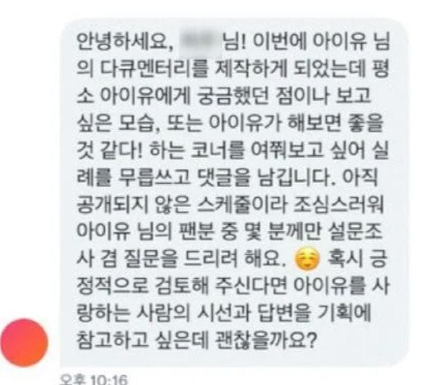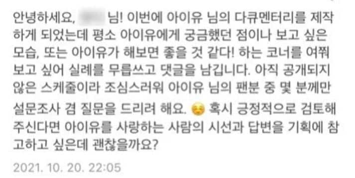 Ayın 4’ünde, şirketi Edam Entertainment hayran kafesinde “IU’nun bugün açıklanan belgeseliyle ilgili hayran görüşlerini izlerken yanıltıcı olabilecek noktalara rastladık ve gerçekleri açıklamak istiyoruz” diye bir duyuru yayınladı.