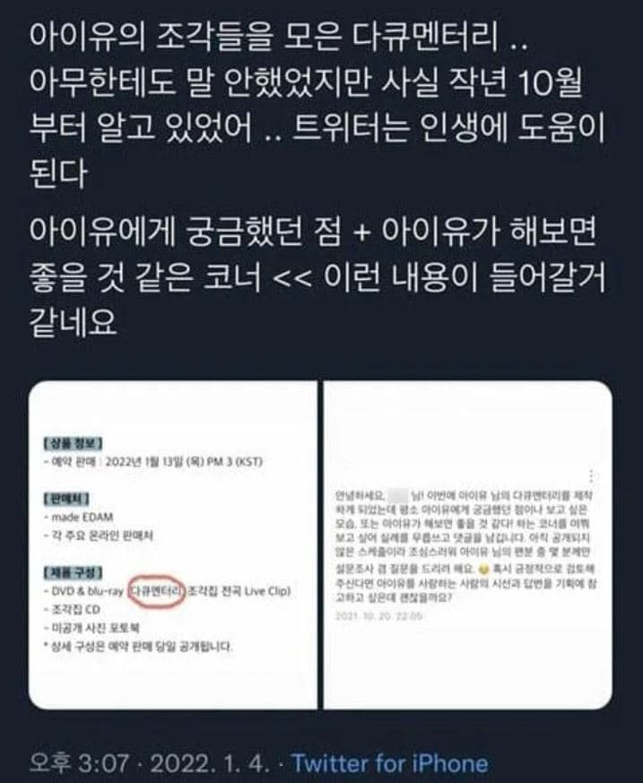 Kendi bestelediğimiz ‘Sculpture Book’ albümü ile IU’nun yirmili yaşlarını anlatan bir belgesel hazırlamaya ve Uaena’ya (fanclub) anlamlı bir hediye hazırlamaya karar verdik. Bunun için yakın zamana kadar IU ile birçok görüşme yaptık ve çekimleri tamamladık. Şu anda post-prodüksiyon sürecindeyiz. Gerçekleri kontrol etmemizin bir sonucu olarak, belgesel yazarının hayranlarla iletişime geçtiğini ve kendi takdirine bağlı olarak, prodüksiyon şirketini seçmek için ön toplantı için gerekli verileri araştırmak için röportajlar yaptığını doğruladık. yazar belgeseli yapmadan önce projeden ayrıldı ve toplanan içerik dahil edilmedi.