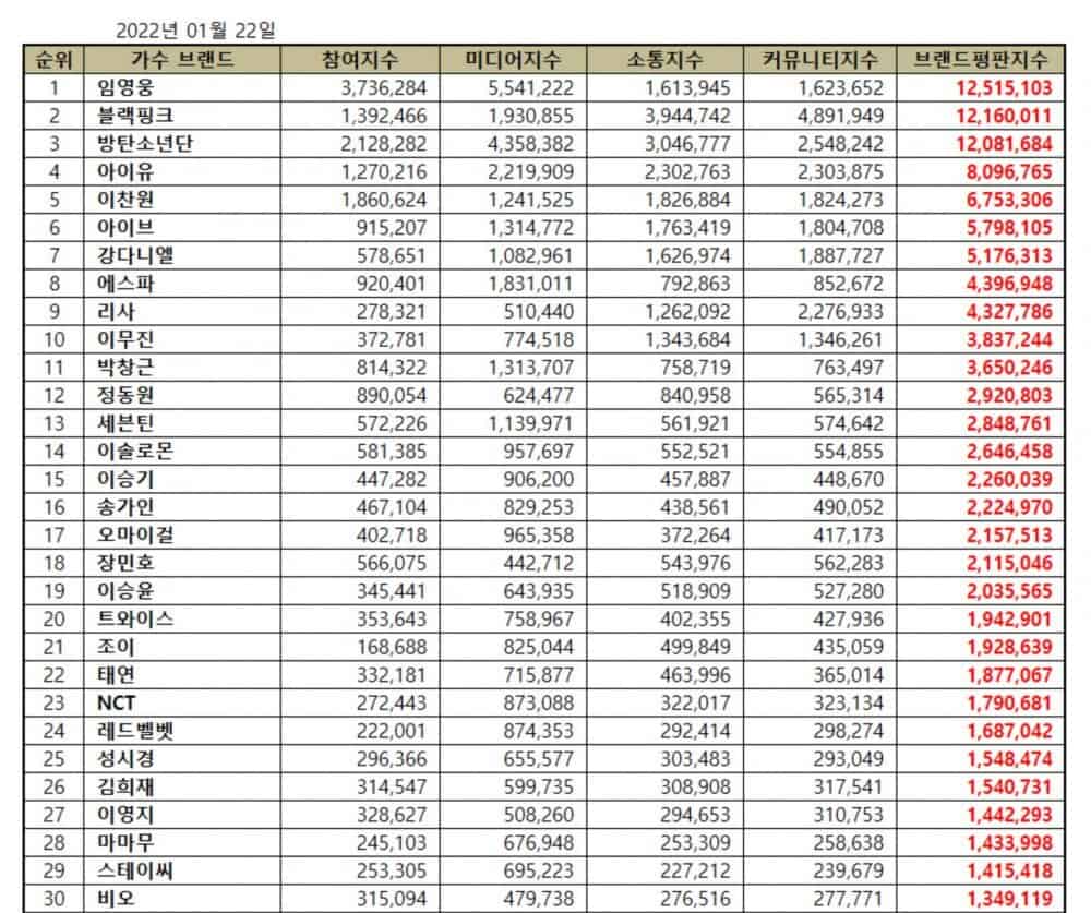 Sıralamalar, 22 Aralık 2021 – 22 Ocak 2022 tarihleri arasında toplanan veriler kullanılarak, şarkıcıların; medya kapsamı, tüketici katılımı, etkileşim ve toplum farkındalığı indekslerinin analiziyle belirlendi.
