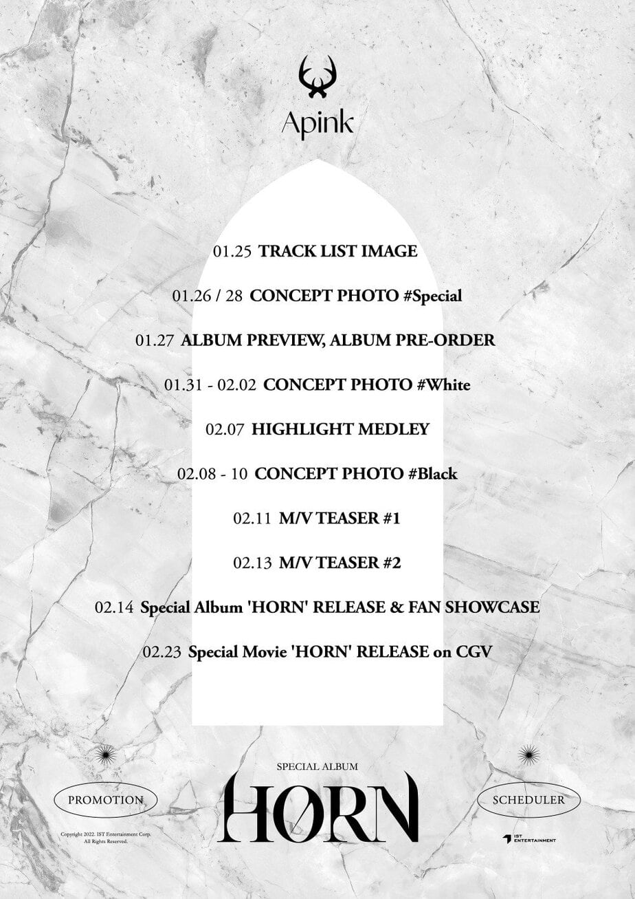 24 Ocak’ta, IST Entertainment kız grubu yaklaşmakta olan özel albümleri HORN için program açıkladı. Programa göre, albümün şarkı listesi, üç grup konsept fotoğrafı (#Special, #White, and #Black), highlight medley ve iki müzik video teaserı yayınlanacak. Ayrıca albümün çıktığı gün bir hayran gösterimi düzenleyecekler. 15 Şubat’ta, albümün yayınlanmasından bir gün sonra, hayranlar CGV lokasyonlarında özel bir HORN filmini de izleyebilecekler.