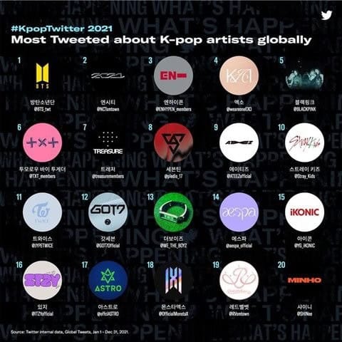 Çeşitli 4. nesil K-Pop grupları, üst sıralara yerleşerek büyük bir sıçrama yaptı. Geçen yılın “Yükselen K-Pop sanatçıları” listesinde 5. sırada yer alan ENHYPEN, geçen yıl tek bir albümü ile “Milyon Satan” oldu ve Billboard 200 listesine 11 numaradan giriş yaptı. ENHYPEN, bu senenin en çok tweet’lenen sanatçıları arasında 3. sırada yer alırken “Dünya Çapında Yükselen Sanatçılar” listesinde zirvede yer almayı başardı.