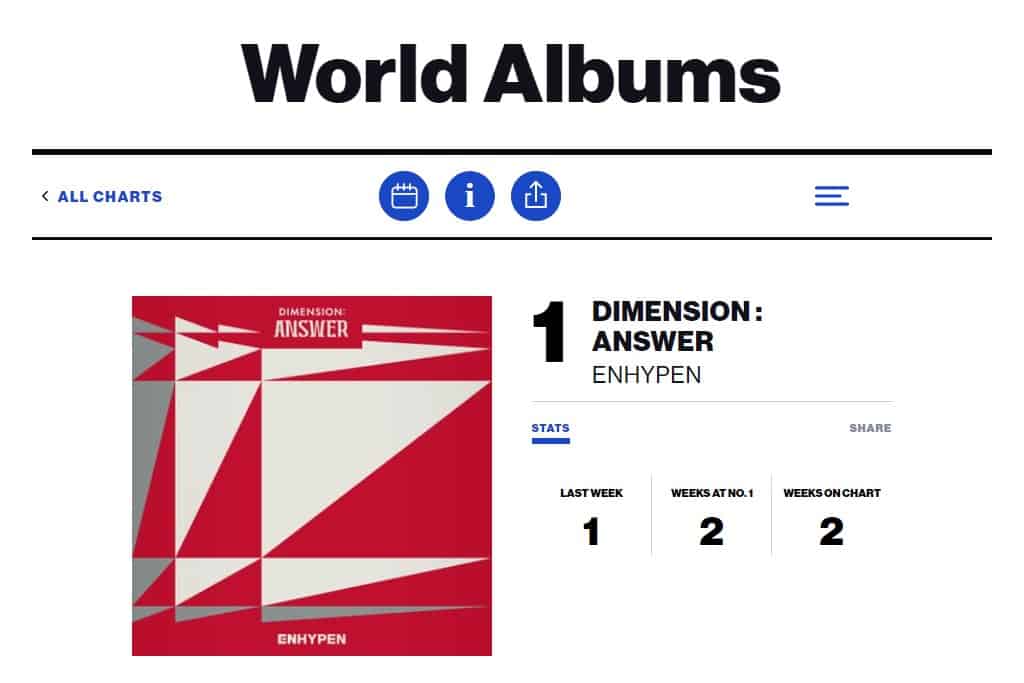 “DIMENSION : ANSWER“, aynı zamanda Billboard‘un Dünya Albümleri listesinde 2. haftasında da 1 numarada yer aldı ve grubun 2 hafta art arda zirveye yerleşebilen ilk albümü oldu.
