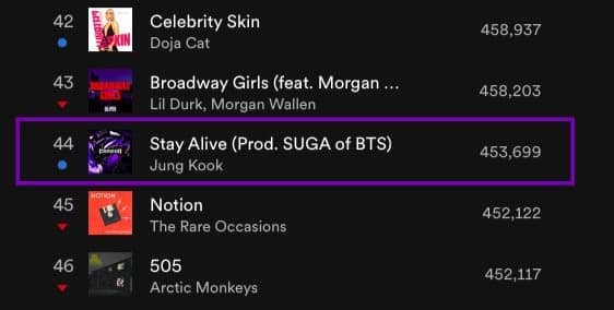 Ve Stay Alive, 2022 yılında Spotify’ın en çok dinlenenler listesinde en büyük çıkışı gerçekleştirmiş 5. şarkı! Ayrıca Jungkook, The Weeknd ile birlikte bu yıl 4 milyondan fazla bir dinlenme ile çıkış yapmış şarkıya sahip tek sanatçı konumunda.