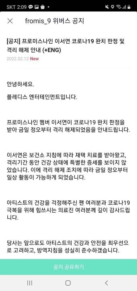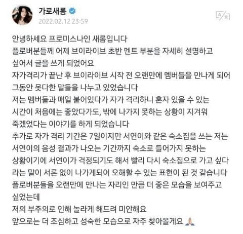 3. [+155, -43] 10 Şubat’ta Lee Saerom’un karantinası bitti, ama onun aksine, üyelerden Lee Seoyeon 12 Şubat’a kadar karantinada kaldı. Saerom ve Seoyeon aynı yurtta yaşıyor, o nedenle Saerom, 12 Şubat’a kadar Seoyeon’u göremedi ve yurduna da gidemedi. “Bundan ölümüne bıktım, hemen eve gitmem lazım” dediği tartışmalı Vlive yayını 11 Şubat’ta gerçekleşti