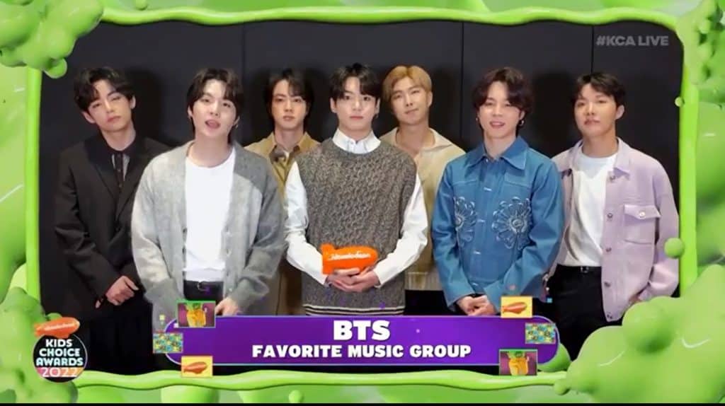 9 Nisan’da, 2022 Nickelodeon Kids’ Choice Ödülleri Santa Monica’da düzenlendi. BTS, Kids’ Choice Ödülleri’nde toplamda 6, üst üste ise 3. kez Favori Müzik Grubu ödülünü evine götürdü.