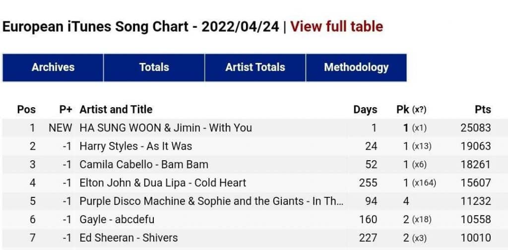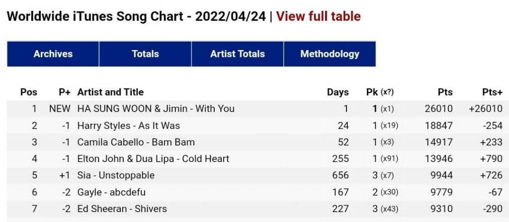 Jimin ve Ha Sung Woon, şarkının, Kore’nin en büyük müzik platformu Melon‘da ilk saatinde 7 numaradan çıkış yapmasıyla, son reformdan sonra en yüksek sıralamadan çıkış yapan solo sanatçılar oldu.