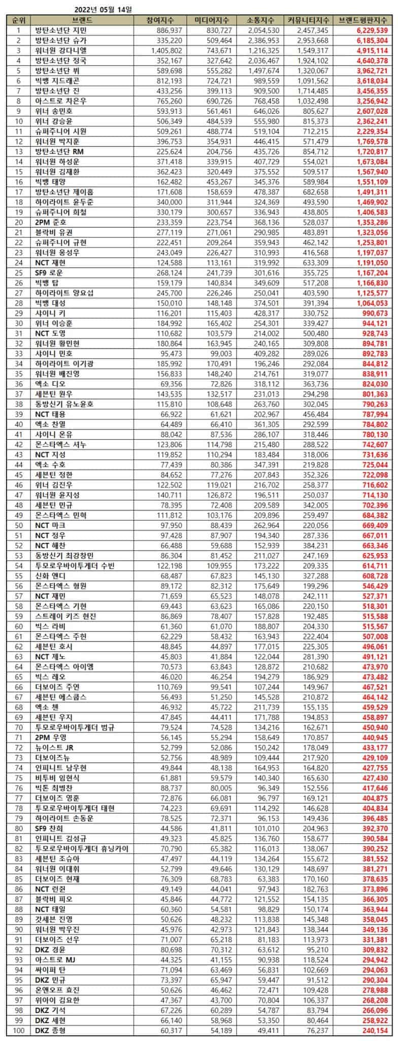 Sıralamalar, 14 Nisan – 14 Mayıs tarihleri arasında toplanan büyük veriler kullanılarak, 703 erkek grubu üyesinin; tüketici katılımı, medya kapsamı, iletişim ve toplum farkındalığı indekslerinin analiziyle belirlendi.