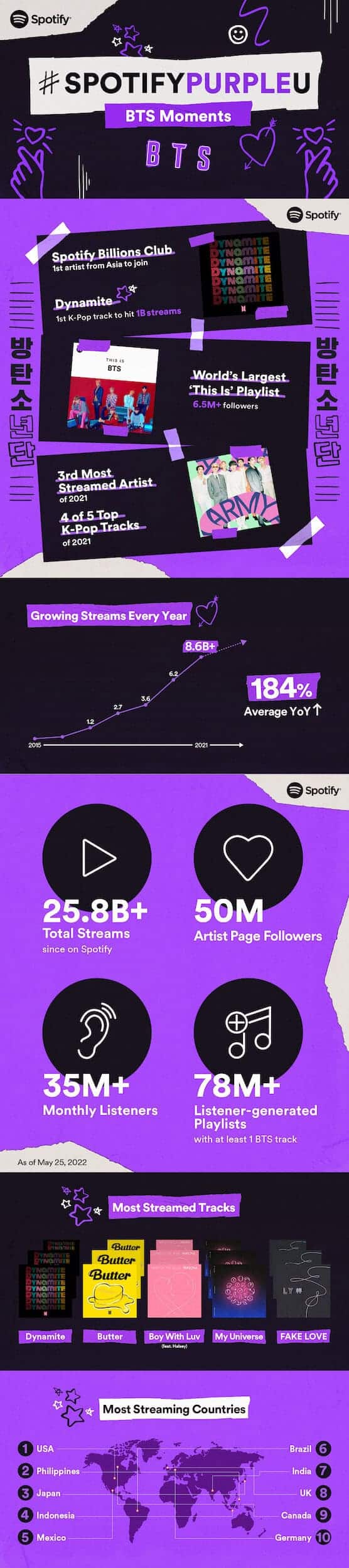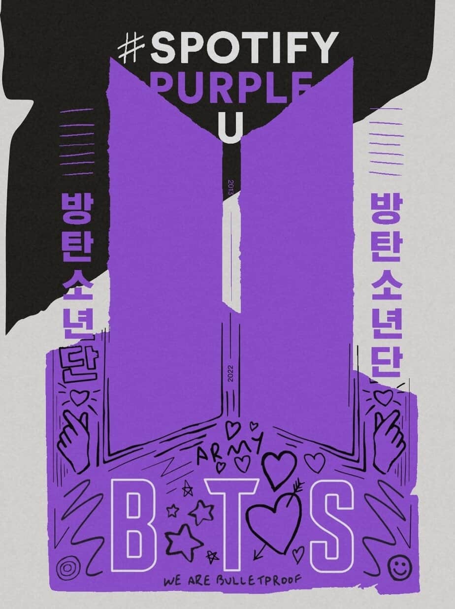 3 Haziran‘dan itibaren BTS ARMY; Güney Kore, Amerika Birleşik Devletleri, Brezilya, Meksika, Hindistan, Japonya, Filipinler, Endonezya, Tayland ve Vietnam da dahil olmak üzere dünyanın dört bir yanındaki #SpotifyPurpleU reklam panolarında yer alacak.