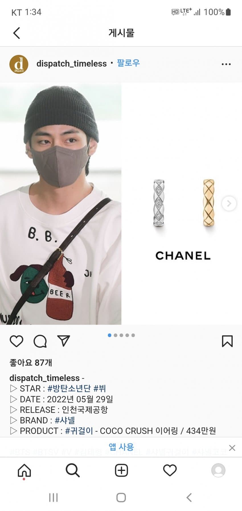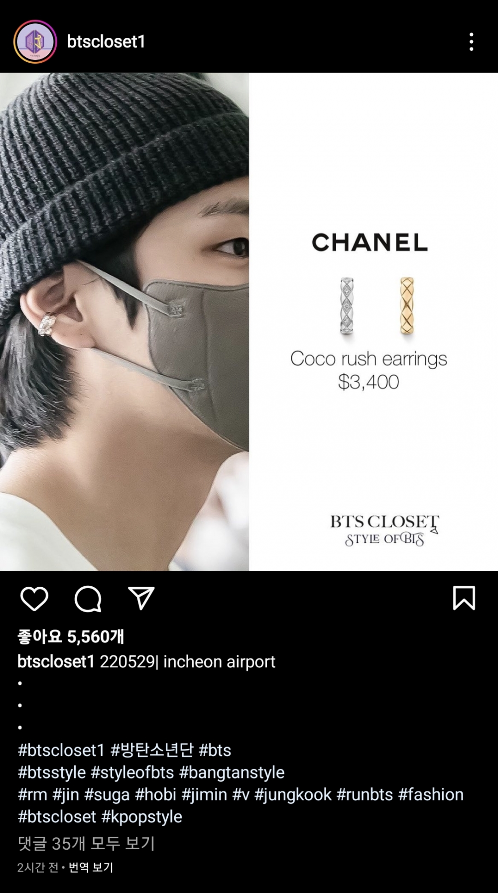 Geçenlerde V havaalanında küpe takarken görüldü. Ünlülerin aksesuar markalarını ve koleksiyon isimlerini yayınlayan Dispatch’in Instagram hesabı, V’nin küpelerinin CHANEL’in Coco Crush’ı olduğunu paylaştıktan sonra, hayranlar ve bazı medya kuruluşları bunların Jennie’nin modelliğini yaptığı küpelerle aynı olduğunu fark etti. Çok geçmeden Dispatch fotoğrafı kaldırdı. Bazı hayranlar ise 1 fotoğrafı yakınlaştırdı ve küpelerin aslında Boucheron’a ait olduğunu ve kare çizgili olduğunu iddia etti. Boucheron’un küpelerinin yanına V’nin fotoğrafını yüklediler ve Boucheron’un fotoğrafı beğenen hesabını etiketlediler. Ancak diğer hayranlar yakınlaştırıldığında piksellerin bozulduğunu iddia etti. Bu yüzden bir fotoğrafta çizgiler kare gibi görünüyordu, ancak diğer fotoğraflarda çizgiler CHANEL’in tasarımı olan üçgendi.