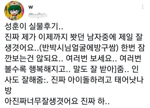 Gerçekten gördüğüm en yakışıklı adam…(Bunu kabul etmek istemeyenler, gidin öncelikle aynaya bakın) Ona bir anda hızlıca bakıp kafanızı çeviremezsiniz… Birkaç kere bakmanız gerekiyor…Ve ona baktıkça, daha mutlu hissettim. O ayrıca güzel konuşuyor ve güzelce selamlıyor. Gerçekten idol olmak için doğmuş gibi. Ah cidden çok yakışıklıydı …