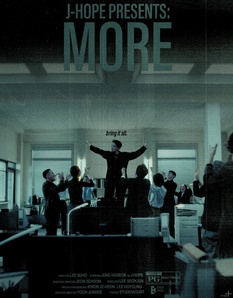 1999’daki Fight Club filminden bazı sahneler için referanslar alınan “MORE” müzik videosu, j-hope‘un sıradan bir ofisi delip geçtiğini, dördüncü duvarı kırdığını ve cesur bir grup tarafından desteklenen şarkıyı seslendirdiğini gösteriyor. HOPE WORLD albümünde, Becky G ile yaptığı “Chicken Noodle Soup” iş birliğinin aksine, BTS’in dans liderinden yoğun koreografi anları olmasa da, müzik videosundaki enerji, sahne performansının nasıl görünebileceğini hayal etmeyi kolaylaştırıyor.