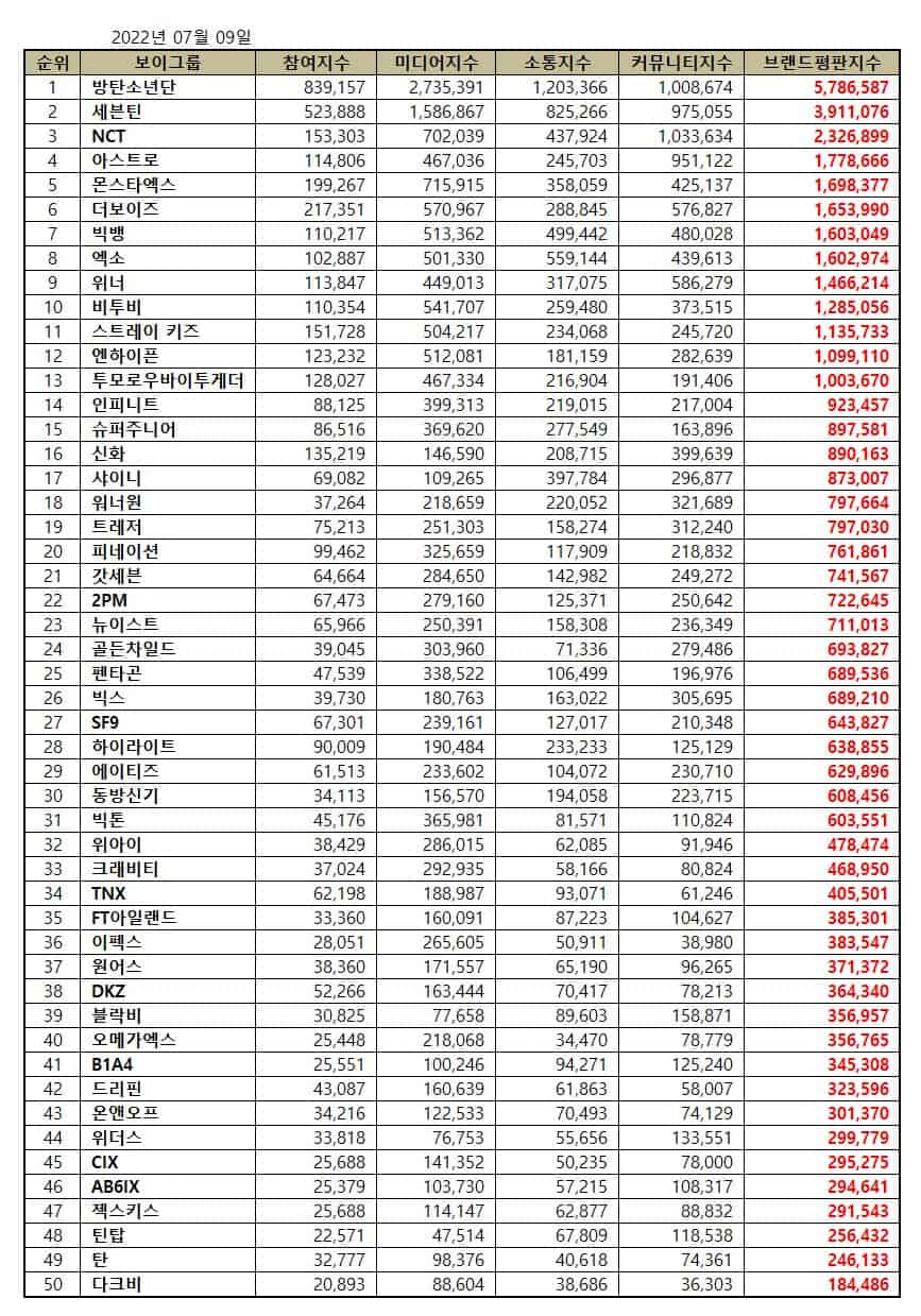 BTS, geçen aydan bu yana puanlarında %50.04 düşüş kaydederek 5.786.587 marka itibar indeksiyle art arda 50. ayında da listenin zirvesinde yer aldı. BTS’in anahtar kelime analizindeki en üst sıralarda Proof, jhope ve Jungkook yer alırken; en üst sıradaki ilgili terimler Tanıtım Yapmak, Albüm Yayımlamak ve Cevaplamak oldu. Grubun pozitiflik-negatiflik analizi %60.89 ile pozitif tepki aldı.