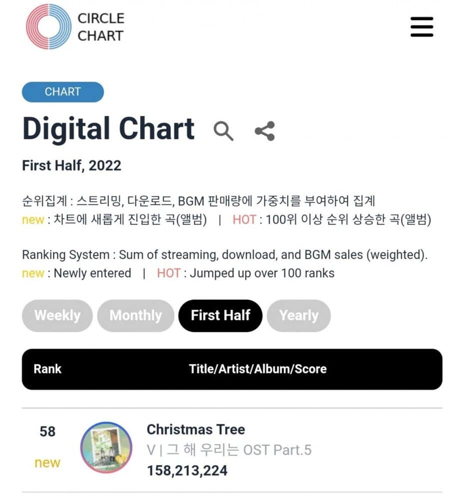 2022’nin ilk yarısında CIRCLE‘a göre BTS‘ten V‘nin Our Beloved Summer dizisi için seslendirdiği Christmas Tree OST’si, 58. sırada yer alarak listede Bir K-Pop Erkek İdolünün En Yüksek Sıradaki Solo Şarkısı oldu.