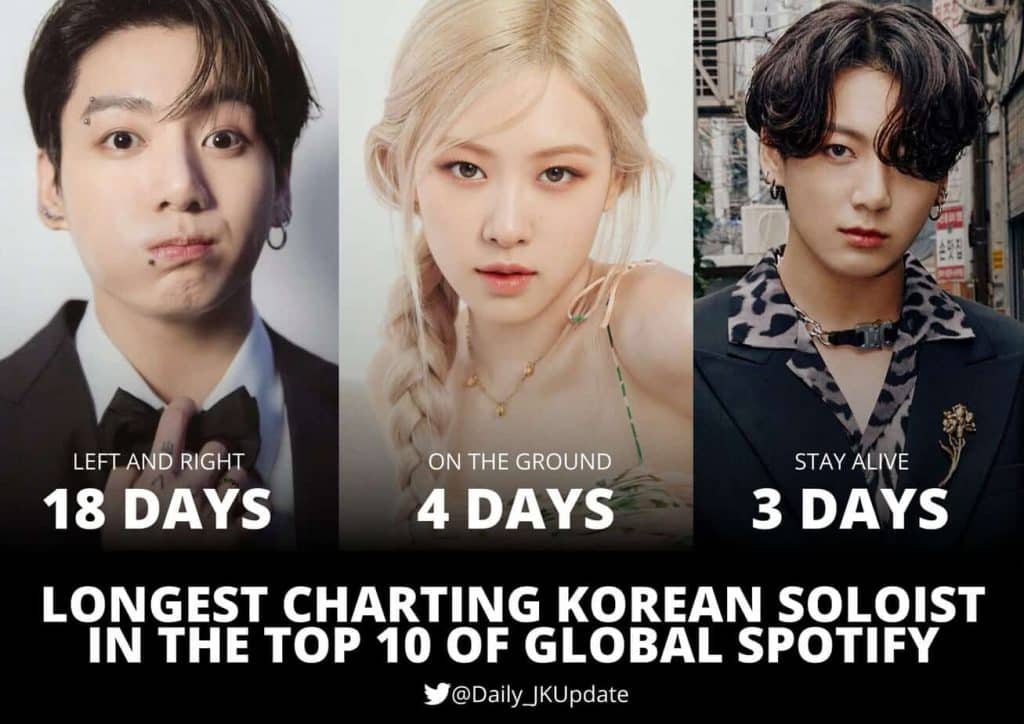 Jungkook, son olarak “Left And Right” ile Spotify‘da BLACKPINK‘ten Rosé‘u geride bırakarak “Aylık En Yüksek Dinleyiciye Sahip Koreli Solist” (14M+) oldu.
