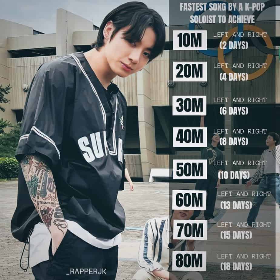 Ve Jungkook, Left And Right ile Spotify üzerinde 2 günde 10 M, 4 günde 20 M, 6 günde 30 M, 8 günde 40 M, 10 günde 50 M, 13 günde 60 M, 15 günde 70 M ve 18 günde 80 M dinlenmeye en hızlı ulaşan Koreli solist oldu.