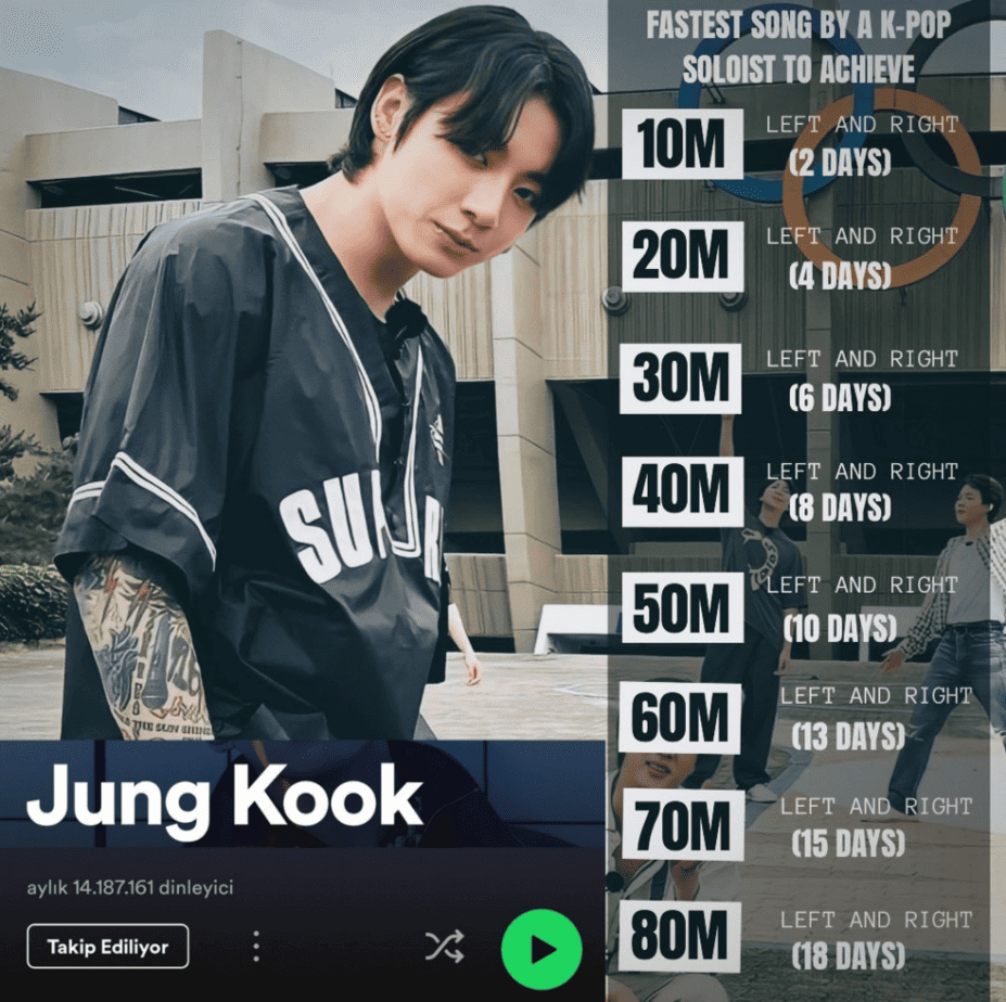 Ayrıca Jungkook, Left And Right ile Global Spotify‘da İlk 10’da en uzun süre kalan Koreli Solist olarak rekorunu genişletti.