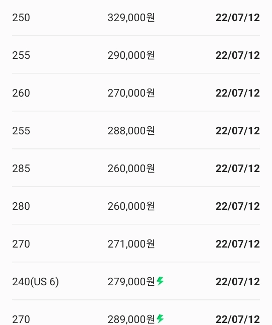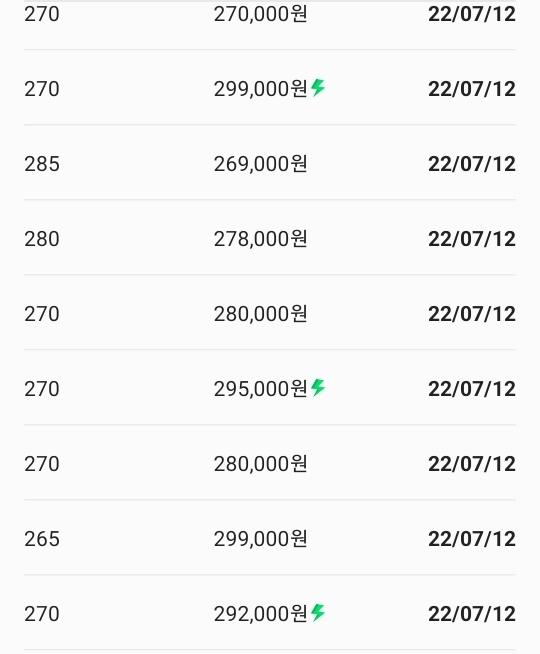 Ayın 12’sine kadar, günde sadece 3-5 çift ayakkabı sattılar (Ç/N: sütunlar: beden | won fiyatı | satın alma tarihi)