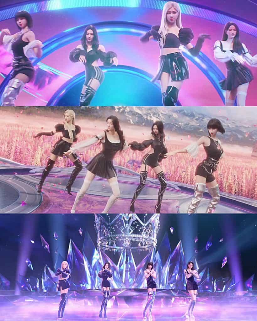 Estetik müzik videosunda BLACKPINK‘in gerçekçi üç boyutlu avatarları şarkı söyleyip dans ederken fantastik bir ortamda büyüleyici efektler görünüyor.