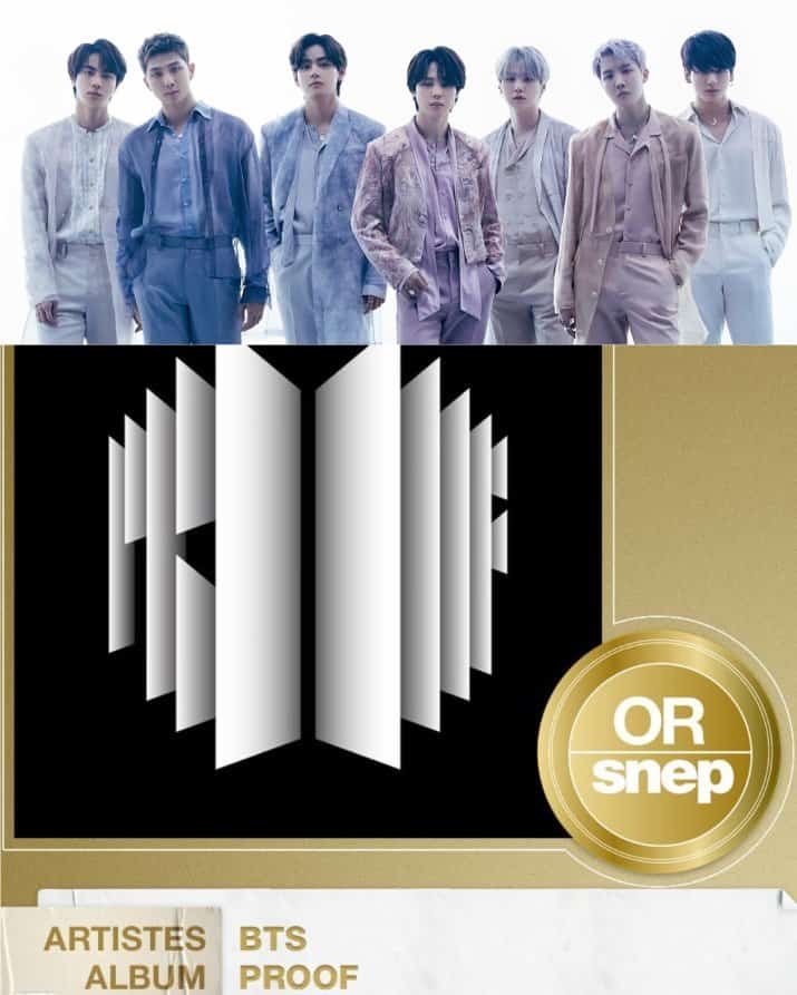 1 Ağustos’ta Fonografik Yayımcılık Ulusal Birliği, BTS‘in “Proof” albümünün Fransa’da ‘Altın Sertifika’ kazandığını duyurdu! Ülkede Altın Sertifika alabilmek için bir albümün 50.000 eşdeğer birim satışa ulaşması gerekiyor.