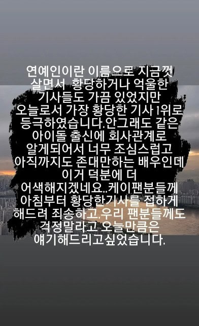 “Bir ünlü olarak, hayatım boyunca bir sürü absürt ve arkasında bir dayanağı olmayan haberler gördüm. Ama bugünün haberi hayatım boyunca gördüğüm en absürt haberler arasında 1 numaraya yükseldi. Kei de eski bir idol olduğu için ve birbirimizle şirketimiz vasıtasıyla tanıştığımız için, çok dikkat ediyorum ve o hala sadece resmi formda konuştuğum bir aktris. Ama bu olaydan dolayı işler daha da tuhaflaşacak… Bu sabah bu saçma haberi okudukları için Kei’nin hayranlarından özür dilerim. Kendi hayranlarıma da endişelenmemeleri gerektiğini söylemek isterim.”