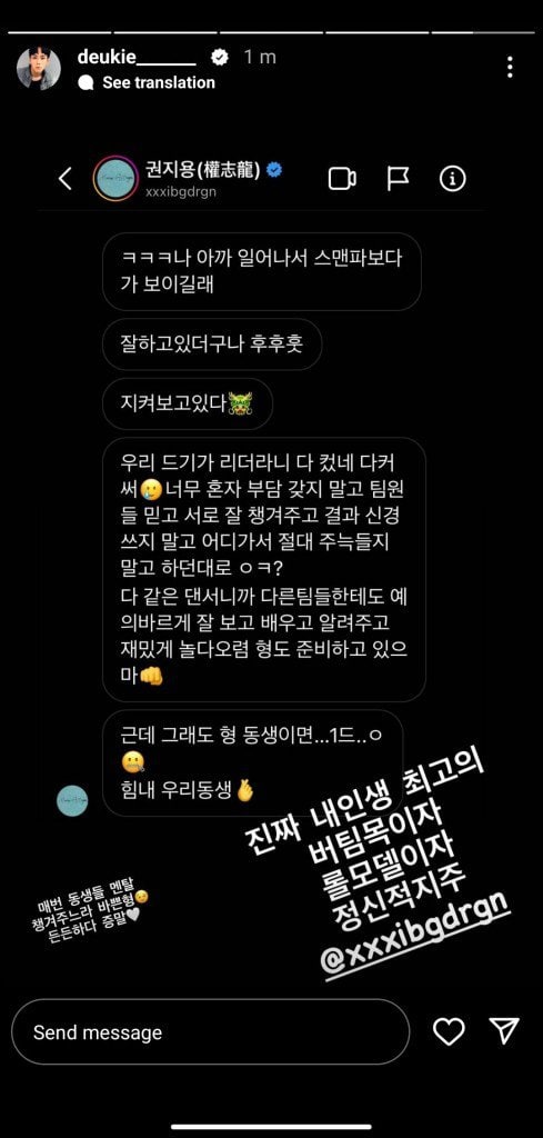 Hepiniz birbirinizin arkadaşı olan dansçılarsınız, bu yüzden diğer takımlara karşı da saygılı olun. Onlardan öğrenin ve onlara öğretin. Eğlenin. Hyung’un da öyle, bir şeyler hazırlıyorum.