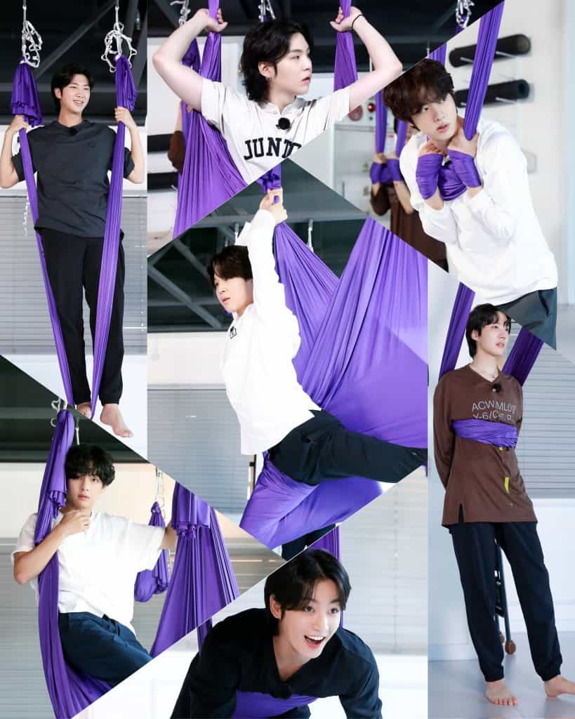 Üyeler uçan yoga için hamakta yerlerini aldıklarında maknae’nin aklına benzersiz bir fikir geldi. Kendini hamağa sardı ve onunla koşarak havaya zıpladı. Onun beklenmedik bir şekilde bunu yaptığını görmek tüm üyeleri kahkahaya boğdu. Jimin ise esprili bir şekilde yoga hocasından onun adına özür diledi.