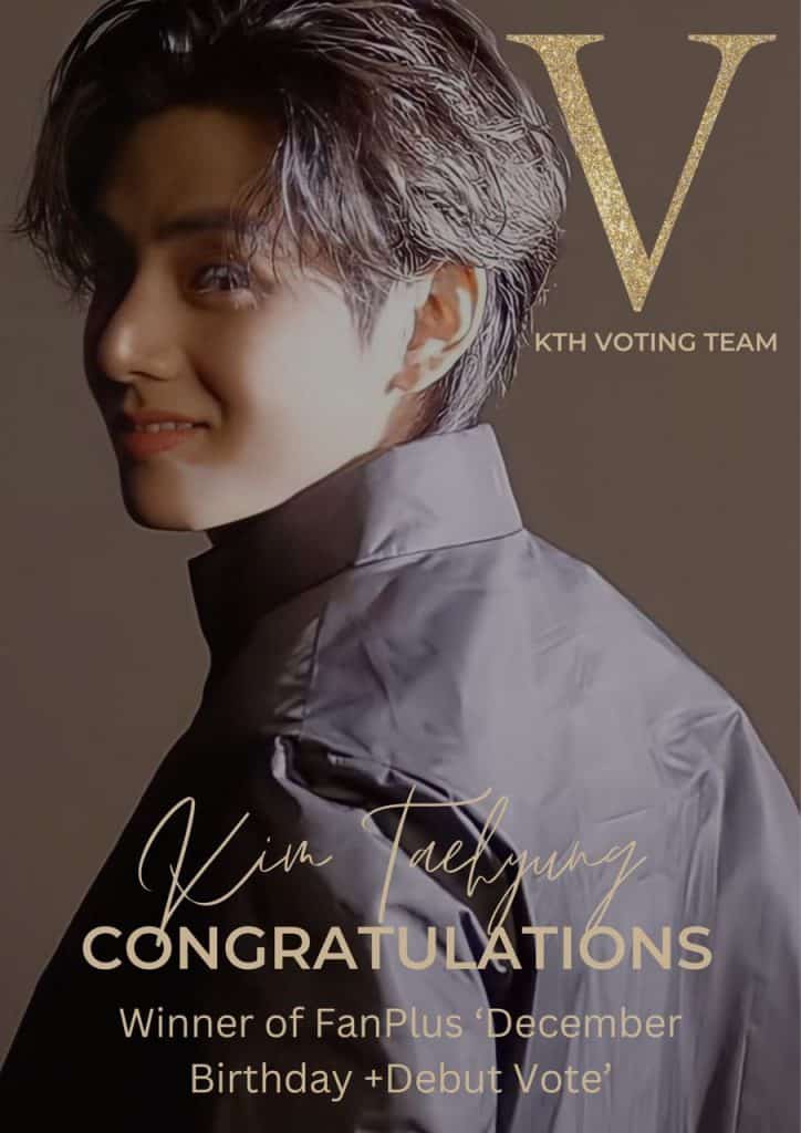 Popüler K-Pop hayran topluluğu FanPlus‘ta Taehyung, aynı ayda doğan sayısız yıldızla birlikte ‘Aralık’ta Doğan İdoller için Oylama Etkinliği’nde aday gösterildi.