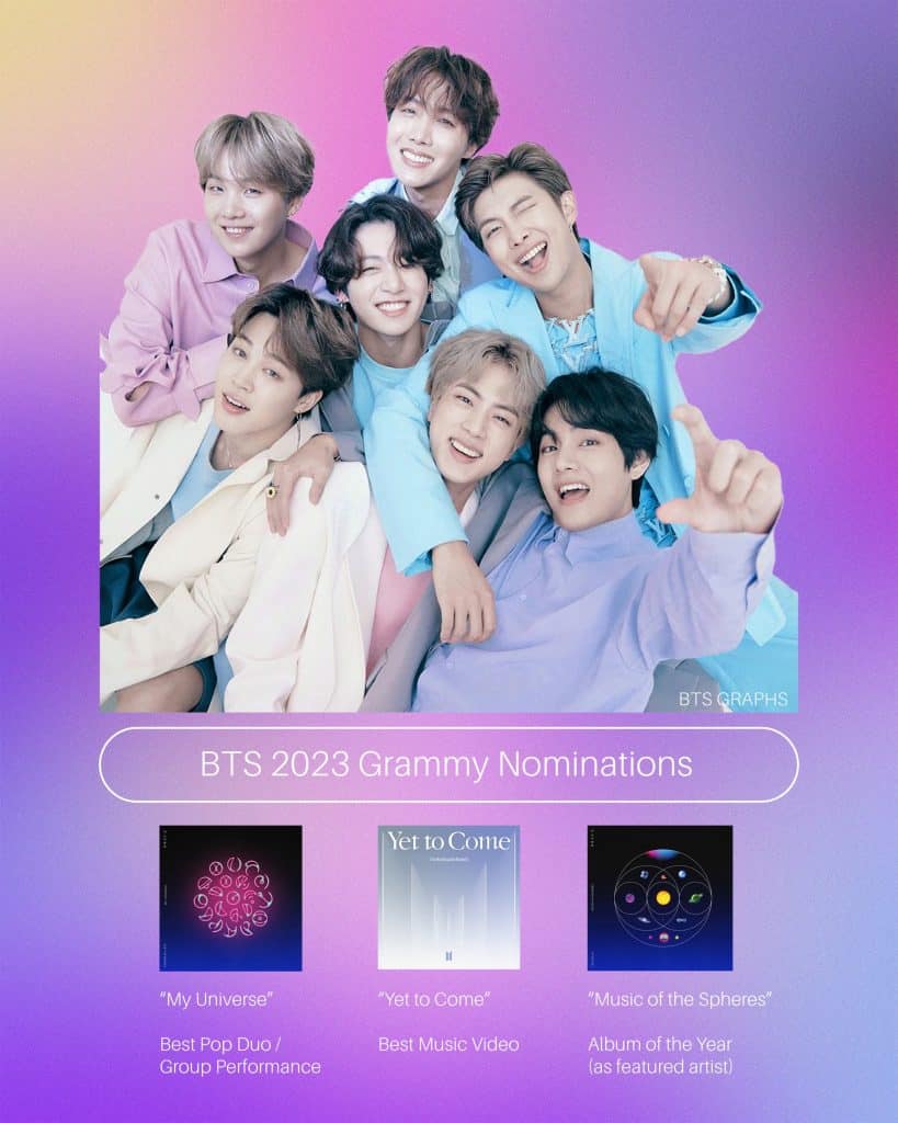RM, SUGA ve j-hope; Coldplay‘in Yılın Albümü‘ne aday gösterilen Music of the Spheres albümünde şarkı söz yazarı olarak yer aldığı için aday oldu.