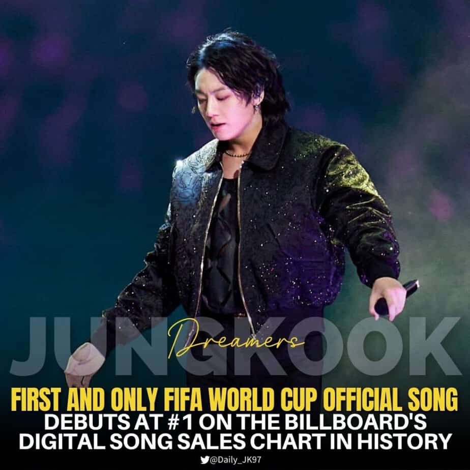 #JungKook of @BTS_twt‘s “Dreamers (#FIFAWorldCup Qatar)” debuts at #1 on this week’s Digital Song Sales chart. It marks his second #1 hit.