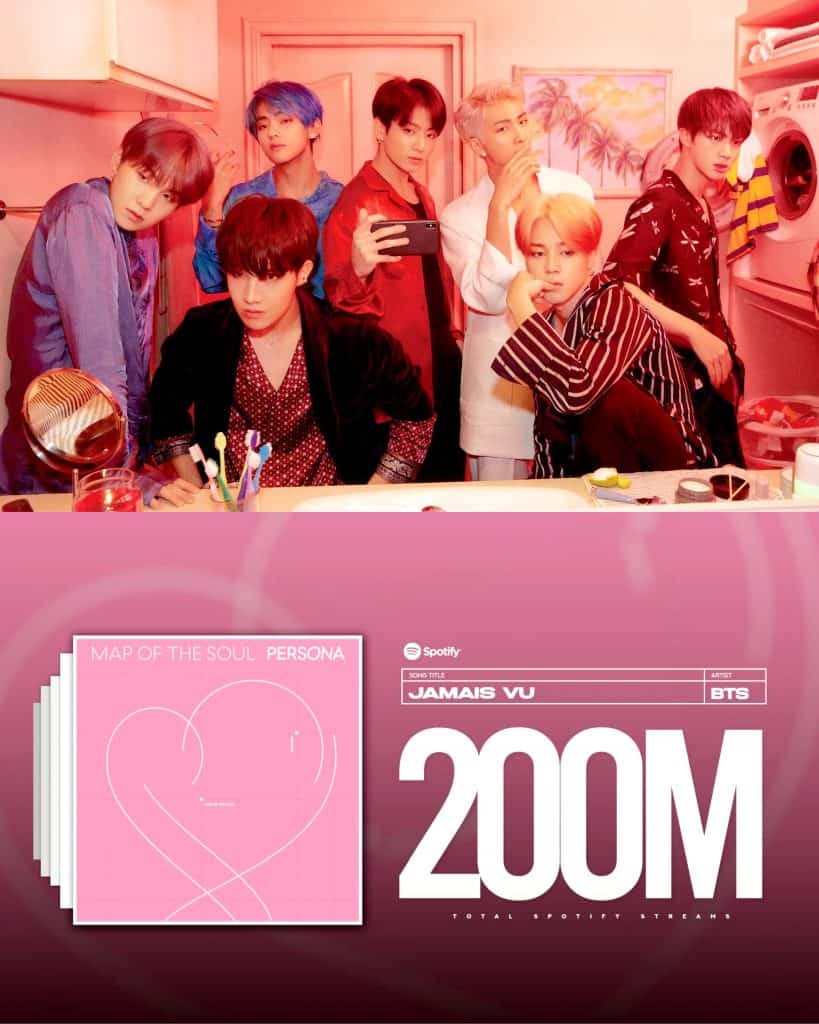 16 Aralık’ta, BTS‘in 2019 yılında yayımlanan MAP OF THE SOUL : PERSONA albümünde yer alan ve Jin & j-hope & Jung Kook üçlüsünün seslendirdiği Jamais Vu şarkısı, Spotify‘da 200 milyon dinlenmeyi aştı ve bunu başaran 50. şarkıları oldu.